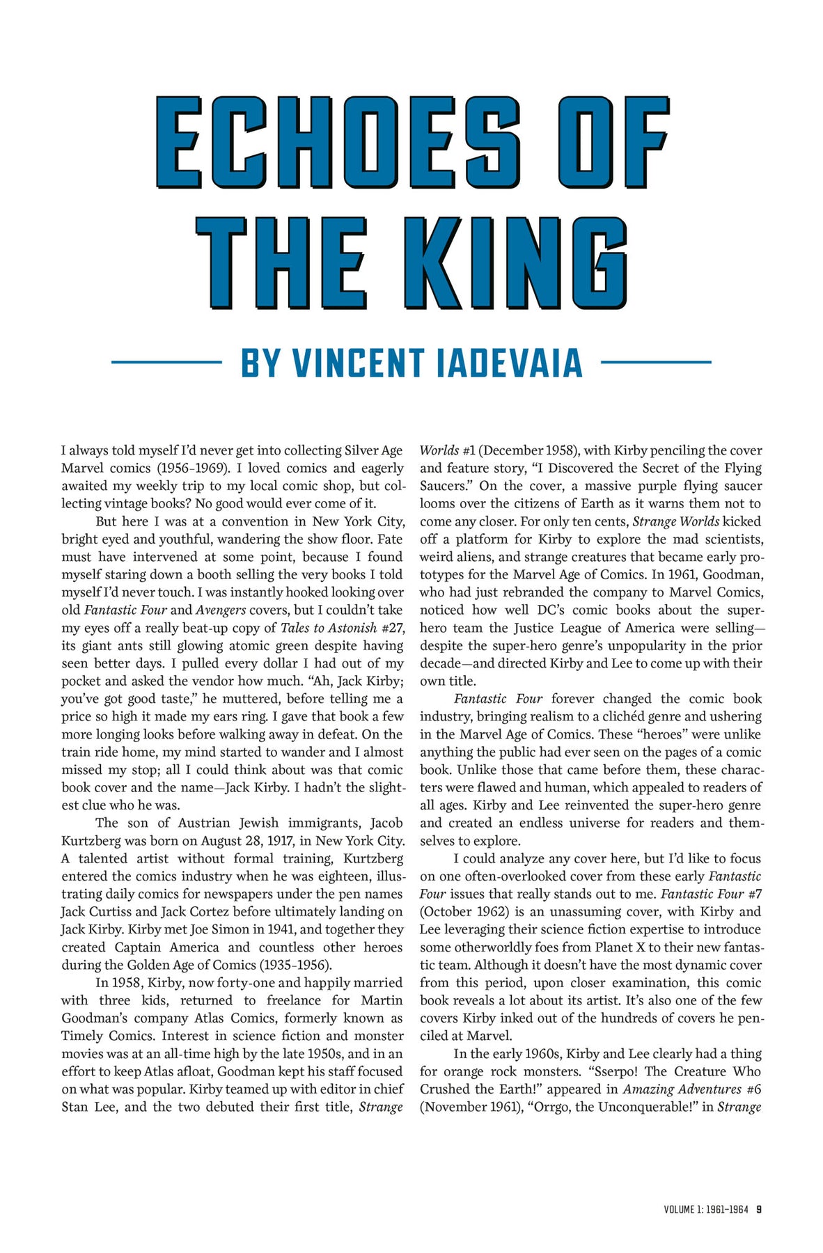 The Marvel Comics Covers of Jack Kirby collects Kirby's cover art in a hardcover format. The first volume of this series contains more than 175 classic Kirby covers from 1961 to 1964, including cover art from the earliest issues of The Avengers, The Fantastic Four, The Incredible Hulk, Journey into Mystery, Strange Tales, Tales to Astonish, and The X-Men, alongside commentary by multiple contributors.